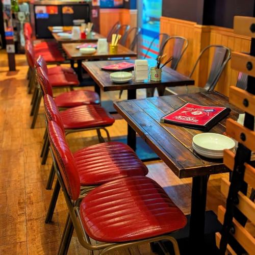 赤レザーの椅子とウッドテーブルの温かいお席!
